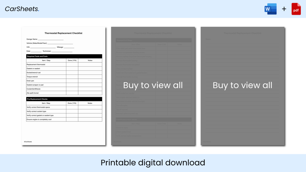 This ©CarSheets checklist is designed to streamline thermostat replacement workflows. Developed for professional garages and service centers, each ©CarSheets checklist follows a consistent format to boost technician efficiency, minimize oversight, and ensure a standardized level of service across teams and locations.