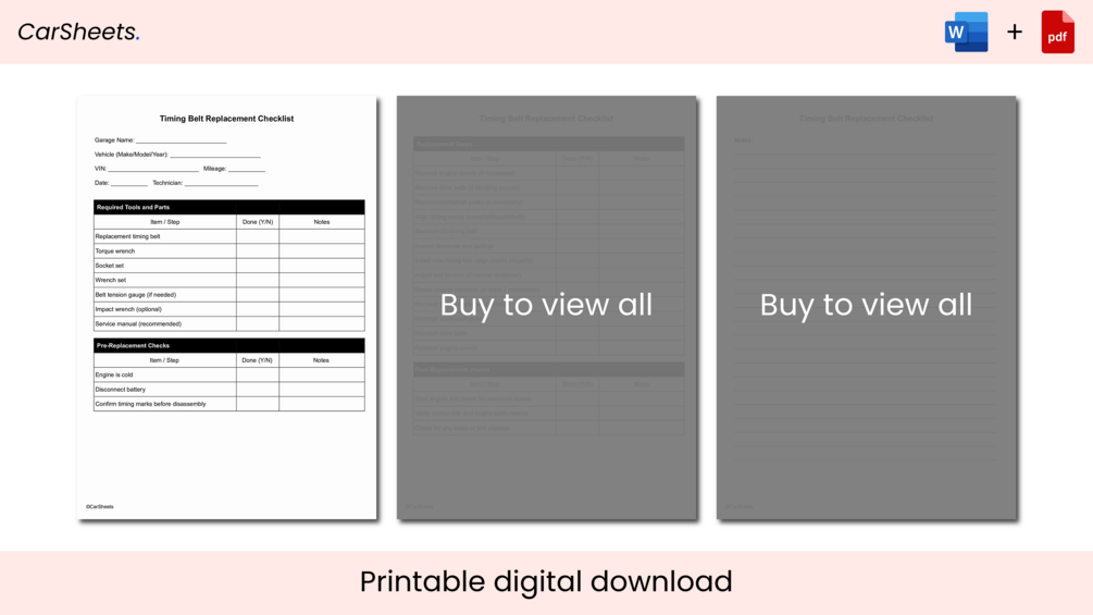 This ©CarSheets checklist is designed to streamline timing belt replacement workflows. Developed for professional garages and service centers, each ©CarSheets checklist follows a consistent format to boost technician efficiency, minimize oversight, and ensure a standardized level of service across teams and locations.